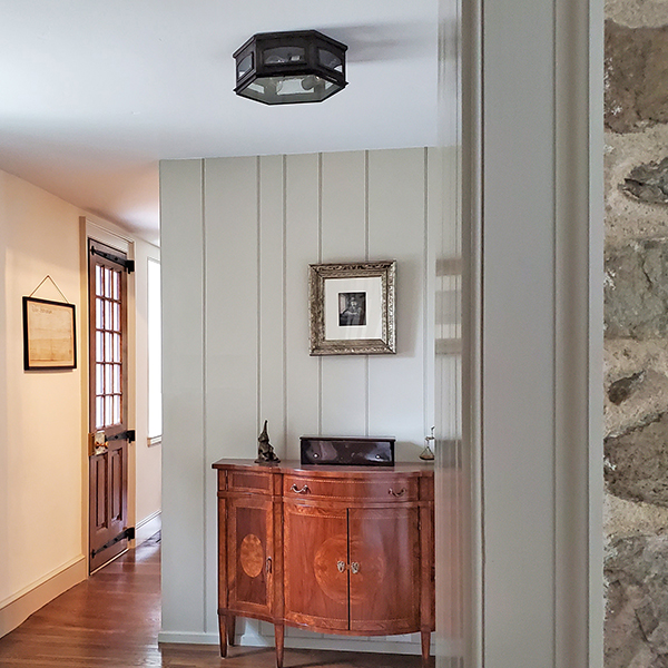 This hexagon ceiling light features arched windows and decorative punchwork.