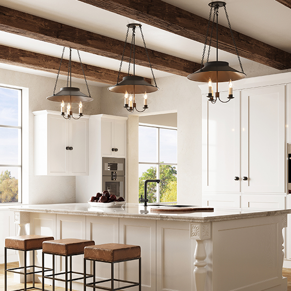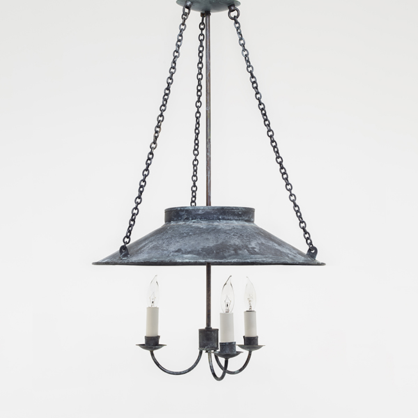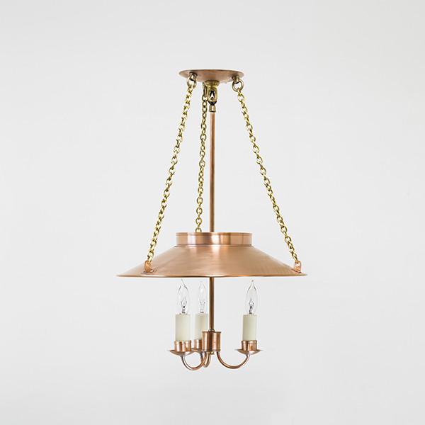 This colonial-style hanging pendant, inspired by the Edison Pendant, features a handspun open shade suspended by a three-lamp cluster and baby oval chain, ideal for a kitchen or island.