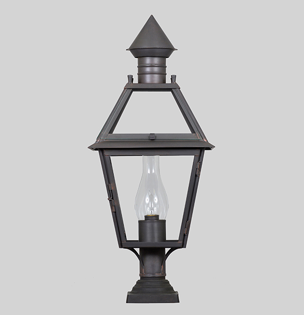 Inspired by an American 18th century wall lantern, this fixture is commonly used on stone wall or turned can be used on stone walls or wooded posts accompanied by a 3″ post collar.