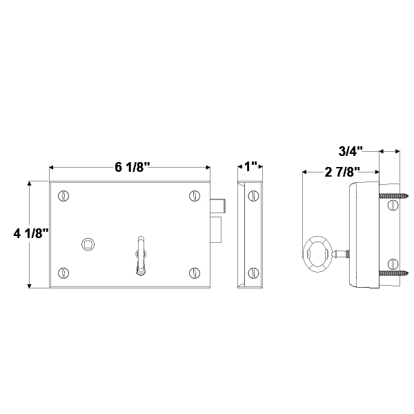 Small cast bass horizontal rim lock with fixed key.